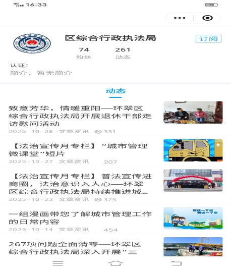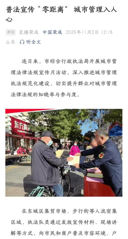 荣成市综合行政执法局对接融媒体中心,在“中国荣成”微信公众号对“城市管理法律法规宣传月”活动进行宣传报道,扩大执法覆盖面,目前阅读量已达385次。