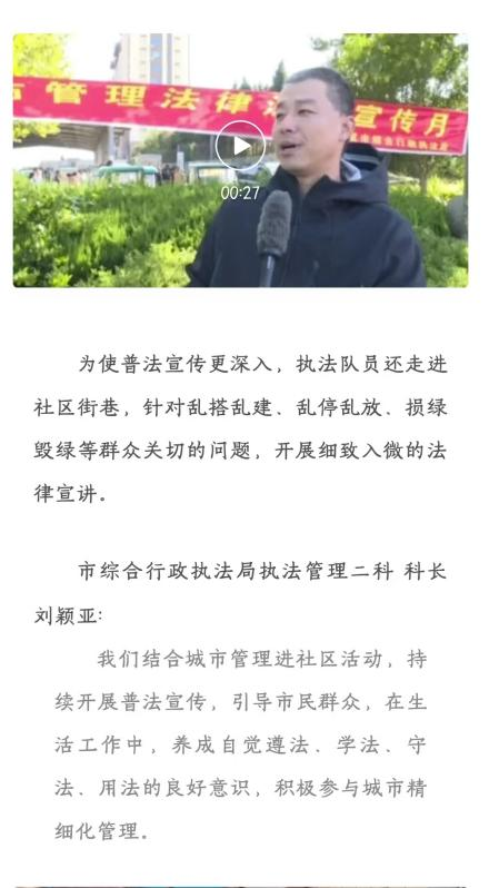 为提升市民对城市管理法律法规的知晓度和参与度,营造学法、懂法、守法、用法的良好社会氛围,市住建局于10月20日启动了城市管理法律法规宣传月活动,本周活动继续深入推进,围绕“上网络驻云端—便捷普法全覆盖”的全新主题,积极拓展线上宣传阵地,依托区市政府官方网站、官方微信公众号、抖音短视频平台等数字化媒介,密集推送系列“法规微课堂”,将城市管理的法规知识以更便捷、更生动、更高效的方式送达广大市民指尖,实现了普法宣传的广覆盖与深渗透。
