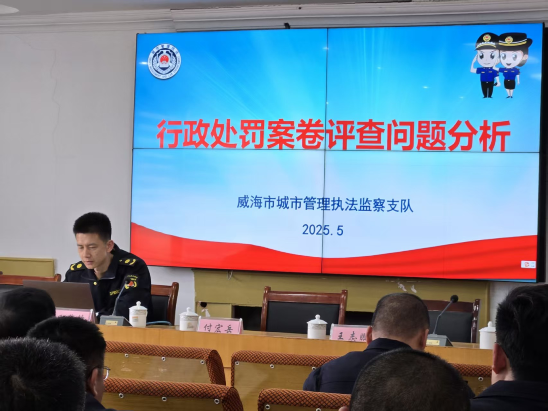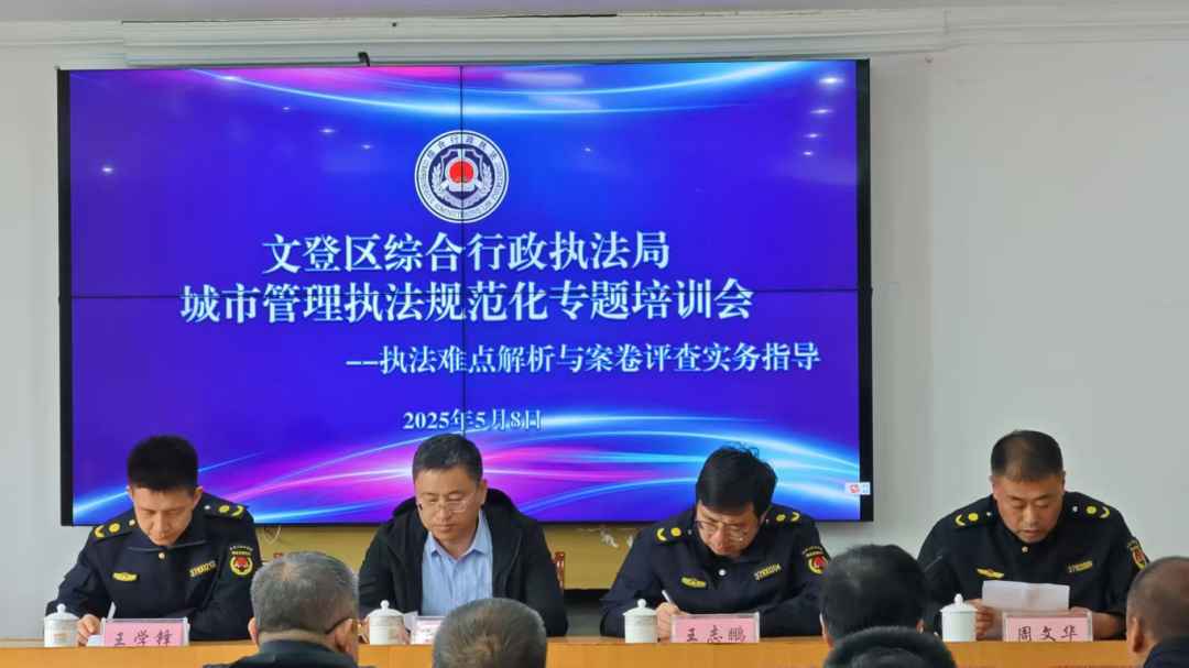 为进一步提升执法规范化水平,破解城市管理领域疑难问题,5月8日,文登区综合行政执法局组织召开“城市管理执法规范化专题培训会 ——执法难点解析与案卷评查实务指导”。本次会议邀请了市住建局矛盾纠纷化解科一级主任科员付宏岳同志、市城管执法监察支队副支队长王志鹏同志、市城管执法监察支队巡查大队大队长王学锋同志莅临指导,并作专题授课。文登区综合行政执法局党组副书记、副局长周文华主持本次培训会,领导班子成员、局机关各科室负责人、各中队中队长及执法队员参会。