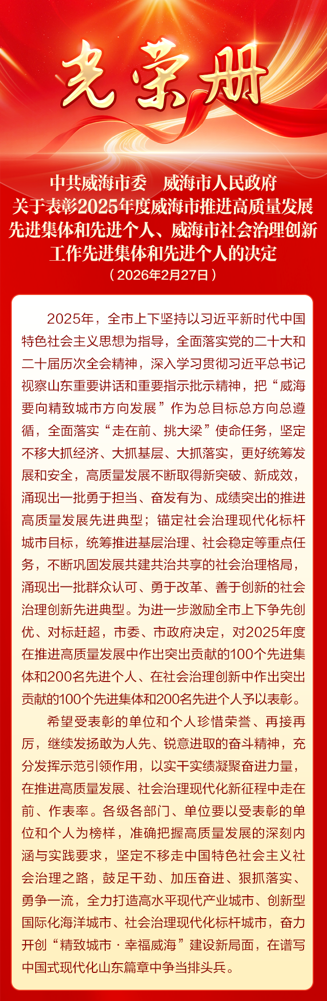 2月27日,全市“振奋精神抓落实、实干担当开新局”工作会议召开。会议隆重表彰了2025年度威海市推进高质量发展先进集体和先进个人、威海市社会治理创新工作先进集体和先进个人,市物业管理协会获评全市社会治理创新工作先进集体。
